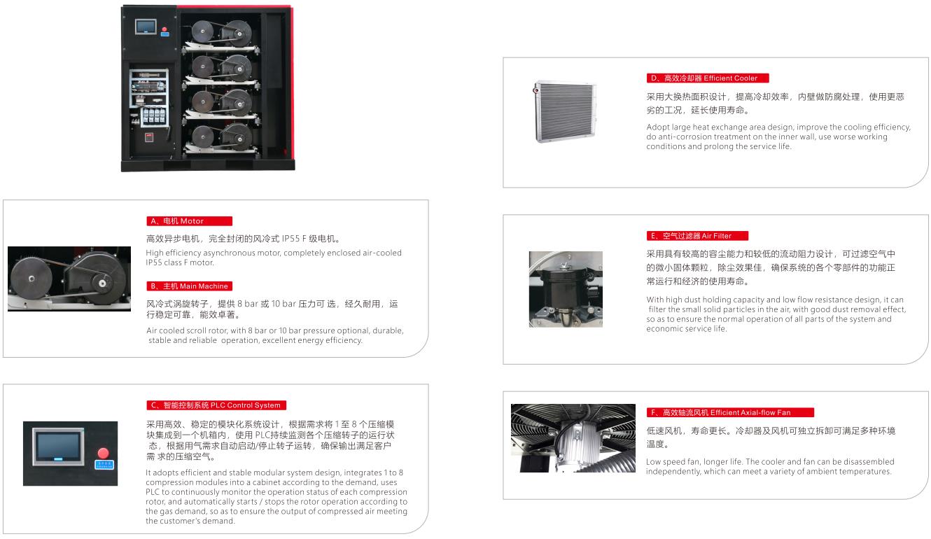 1.無油渦旋式壓縮機(jī),無需要使用油和水及對應(yīng)的后處理,不僅環(huán)保,成本也低。